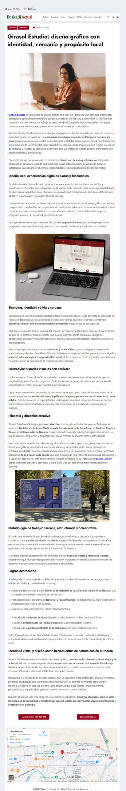 Este mes Girasol Estudio ha dado un paso más en su crecimiento al aparecer en el periódico online Euskadi Actual, donde se describió la filosofía, los valores y el enfoque creativo que hacemos cada día desde nuestro estudio en Pamplona.