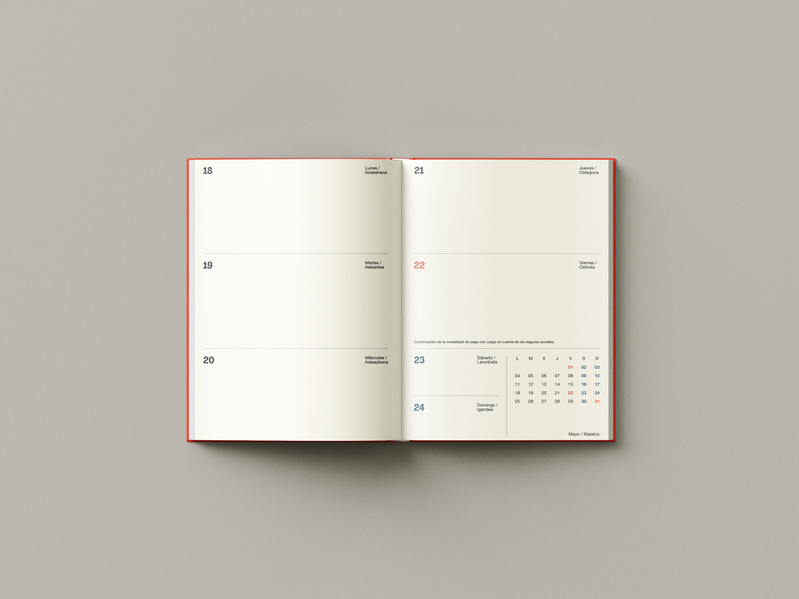 He participado en este proyecto realizando la maquetación de la agenda, en colaboración con otros diseñadores e ilustradores de Navarra. Mi trabajo se ha centrado en la maquetación interior, la organización de los contenidos, la creación de retículas, jerarquías tipográficas y ritmos de página, cuidando cada detalle para que la agenda fuera clara, funcional y agradable de usar. El resultado es una agenda práctica y contemporánea, donde el diseño acompaña al contenido y facilita su uso diario.
